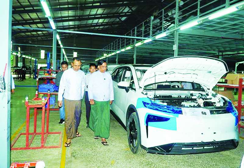 အမျိုးသားအဆင့် လျှပ်စစ်သုံးယာဉ်နှင့်ဆက်စပ်လုပ်ငန်းများ ဖွံ့ဖြိုးတိုးတက်ရေး ဦးဆောင်ကော်မတီ ဒုတိယဥက္ကဋ္ဌ စက်မှုဝန်ကြီးဌာန ပြည်ထောင်စုဝန်ကြီး ဒေါက်တာ ချာလီသန်းသည် ယနေ့မွန်းလွဲပိုင်းတွင် ပဲခူးတိုင်းဒေသကြီး စက်မှုဇုန်ရှိ မြင့်မြတ်မောင် ကုမ္ပဏီလီမိတက်၏ SKD စနစ်ဖြင့် လျှပ်စစ်သုံးမော်တော်ယာဉ်များ တပ်ဆင်ထုတ်လုပ်သည့်စက်ရုံ၌ Dongfeng အမှတ်တံဆိပ် လျှပ်စစ်သုံးမော်တော်ယာဉ်များ တပ်ဆင်ထုတ်လုပ်နေမှုကို လှည့်လည်ကြည့်ရှုသည်။