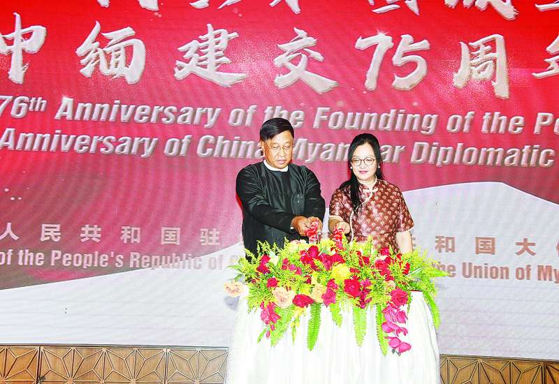 တရုတ်ပြည်သူ့သမ္မတနိုင်ငံ တည်ထောင်သည့် (၇၆) နှစ်မြောက် နှစ်ပတ်လည်နှင့် မြန်မာ- တရုတ် သံတမန်ဆက်ဆံရေး (၇၅) နှစ်ပြည့် အထိမ်းအမှတ်ဧည့်ခံပွဲအခမ်းအနားကို ယနေ့ ညနေပိုင်းတွင် ရန်ကုန်မြို့ မင်္ဂလာတောင်ညွန့်မြို့နယ်ရှိ WYNDHAM GRAND Yangon Hotel ၌ ကျင်းပရာ နိုင်ငံတော်သမ္မတရုံးဝန်ကြီးဌာန (၁) ပြည်ထောင်စုဝန်ကြီး ဦးတင်အောင်စန်းနှင့် ဇနီးတို့ တက်ရောက်ကြသည်။