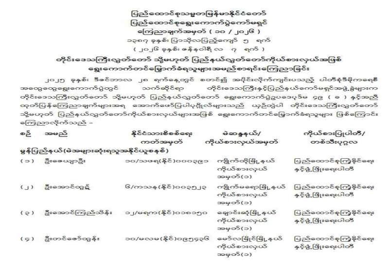 တိုင်းဒေသကြီးလွှတ်တော် သို့မဟုတ် ပြည်နယ်လွှတ်တော်ကိုယ်စားလှယ်အဖြစ် ရွေးကောက်တင်မြှောက်ခံရသူများအမည်စာရင်း ကြေညာခြင်း