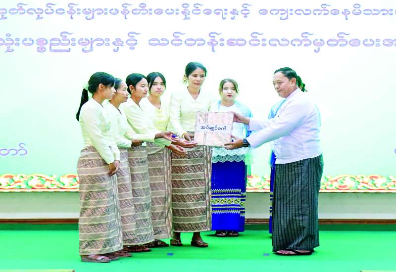 အသေးစားကုန်ထုတ်လုပ်ငန်းများဖန်တီးပေးနိုင်ရေးနှင့် ကျေးလက်နေမိသားစုဝင်ငွေတိုးရေး စီမံကိန်းလုပ်ငန်းဆိုင်ရာ လုပ်ငန်းသုံးပစ္စည်းများနှင့် သင်တန်းဆင်းလက်မှတ်များ ပေးအပ်ပွဲအခမ်းအနားကို ယနေ့နံနက်ပိုင်းက နေပြည်တော်ကောင်စီနယ်မြေ အစိုးရအဖွဲ့ရုံး ဇဗ္ဗူသီရိခန်းမ၌ ကျင်းပသည်။