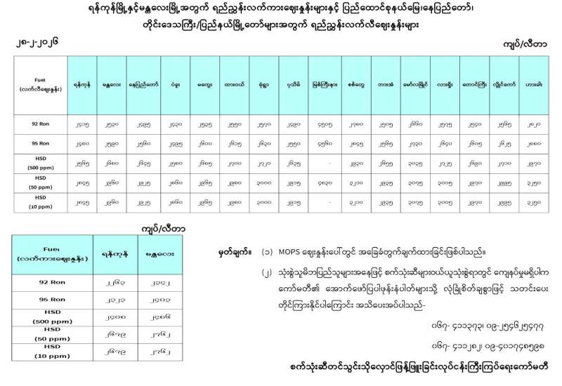 ရန်ကုန်မြို့နှင့် မန္တလေးမြို့အတွက် ရည်ညွှန်းလက်ကားဈေးနှုန်းများနှင့် ပြည်ထောင်စုနယ်မြေ နေပြည်တော်၊ တိုင်းဒေသကြီး/ပြည်နယ် မြို့တော်များအတွက် ရည်ညွှန်းလက်လီဈေးနှုန်းများ