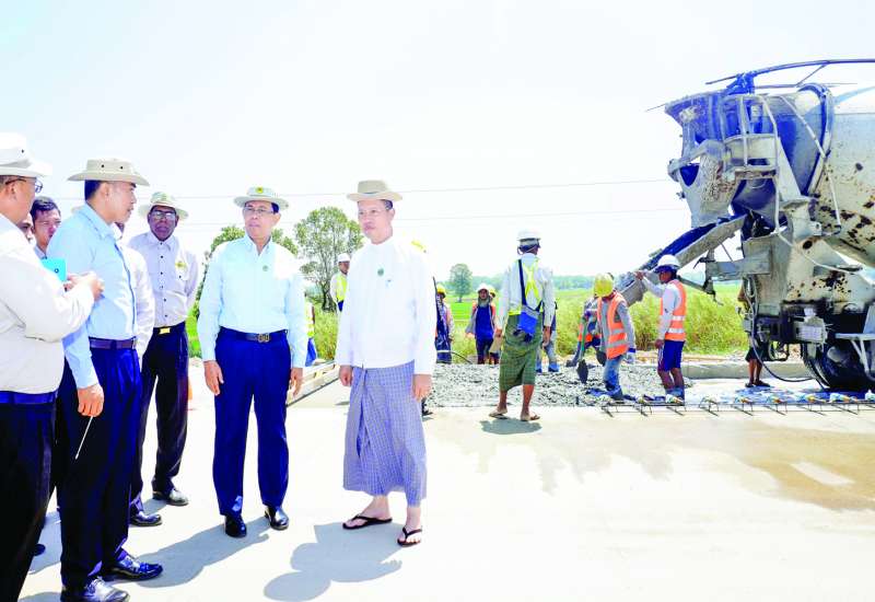 ဆောက်လုပ်ရေးဝန်ကြီးဌာန ပြည်ထောင်စုဝန်ကြီးဦးမျိုးသန့်သည် တာဝန်ရှိသူများနှင့်အတူ ယနေ့တွင် ရန်ကုန် - ပုသိမ်လမ်းပိုင်း ပြုပြင်ထိန်းသိမ်းရေးလုပ်ငန်းများ ဆောင်ရွက်နေမှုကို ကြည့်ရှုစစ်ဆေးသည်။