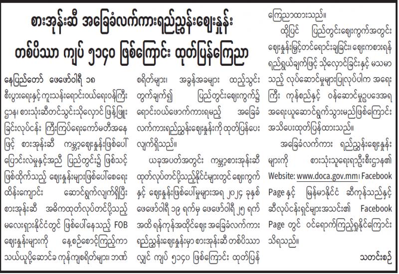 ရန်ကုန်မြို့နှင့် မန္တလေးမြို့အတွက် ရည်ညွှန်းလက်ကားဈေးနှုန်းများနှင့် ပြည်ထောင်စုနယ်မြေ နေပြည်တော်၊ တိုင်းဒေသကြီး/ပြည်နယ် မြို့တော်များအတွက် ရည်ညွှန်းလက်လီဈေးနှုန်းများ