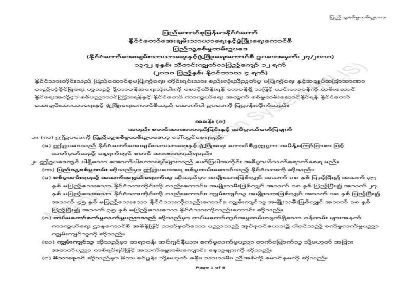 ၂၀၁၄ ခုနှစ် ပုံနှိပ်ခြင်းနှင့်ထုတ်ဝေခြင်းလုပ်ငန်းဥပဒေ၊ နည်းဥပဒေများအရ ထုတ်ဝေသူများသည် မိမိတို့ ထုတ်ဝေသည့် စာအုပ်စာစောင် ၅ အုပ် သို့မဟုတ် ၅ စောင်ကို ပြန်ကြားရေးဝန်ကြီးဌာနသို့ အဖိုးအခ လွတ်ပေးအပ်ရမည်ဖြစ်ပါသည်။ ပြန်ကြားရေးဝန်ကြီးဌာနသည် အဆိုပါ စာအုပ်စာစောင်များကို မူပိုင်ခွင့်နှင့် စာအုပ်စာရင်း ၂ အုပ်၊ အမျိုးသားစာပေဆုစိစစ်ရွေးချယ်ရေးကော်မတီသို့ ၂ အုပ်နှင့် အမျိုးသားမှတ်တမ်းများမော်ကွန်းတိုက်ဦးစီးဌာနသို့ ၁ အုပ် ပေးပို့လျက်ရှိပါသည်။