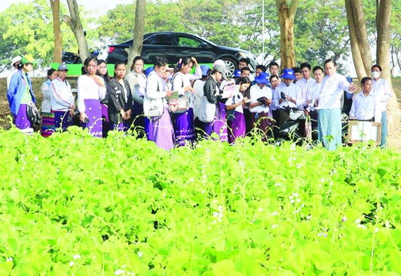 ရေဆင်းစိုက်ပျိုးရေးတက္ကသိုလ် ပါမောက္ခ ဒေါက်တာအောင်ဝင်း ဦးဆောင်သော နောက်ဆုံးနှစ် ကျောင်းသား ကျောင်းသူများသည် ယနေ့နံနက်ပိုင်းတွင် သီးနှံစုံ အကန့်လိုက် စိုက်ပျိုးနည်းစနစ် တောင်သူပညာပေး သရုပ်ပြစိုက်ခင်းသို့ လာရောက်လေ့လာကြရာ စိုက်ပျိုးရေး၊ မွေးမြူရေးနှင့် ဆည်မြောင်းဝန်ကြီးဌာန ဒုတိယဝန်ကြီး ဒေါက်တာတင်ထွဋ်က နည်းပညာရပ်ဆိုင်ရာ သိမှတ်ဖွယ်ရာများ ဆွေးနွေးပြောကြားသည်။