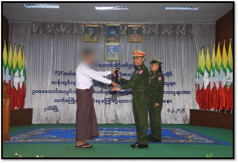 နိုင်ငံတော်စီမံအုပ်ချုပ်ရေးကောင်စီသည် PDF အပါအဝင် အဖွဲ့အစည်းအမျိုးမျိုးအမည်ခံ၍ လက်နက်ကိုင်ဆန့်ကျင်လျက်ရှိသည့် အဖွဲ့အစည်းများအတွင်း ရောက်ရှိနေသူများအား ဥပဒေဘောင်အတွင်းသို့ ပြန်လည်ဝင်ရောက်ရန် ဖိတ်ခေါ်လျက်ရှိပြီး ဥပဒေဘောင်အတွင်းသို့ ဝင်ရောက်လာသူများကိုလည်း လိုအပ်သည့်ကူညီပံ့ပိုးမှုများ ဆောင်ရွက်ပေးသွားမည်ဖြစ်ကြောင်းနှင့် လက်နက်/ခဲယမ်းများဖြင့် ဝင်ရောက်လာသူများကို ဆုကြေးငွေများ သီးသန့်ထောက်ပံ့ပေးသွားမည်ဖြစ်ကြောင်း သတင်းထုတ်ပြန်ထားပြီးဖြစ်ရာ ယနေ့တွင်လည်း ဥပဒေဘောင်အတွင်း ဝင်ရောက်လာသည့် ပြစ်မှုကျူးလွန်ခြင်းမရှိသော PDF သင်တန်းဆင်းအလင်းဝင်ရောက်သူများအား မိဘအုပ်ထိန်းသူများထံ လွှဲပြောင်းအပ်နှံခြင်းနှင့် နယ်မြေလုံခြုံရေးဆောင်ရွက်စဉ် လက်နက်၊ ခဲယမ်းများ ဖော်ထုတ်ဖမ်းဆီးရမိခဲ့သည့် လုံခြုံရေးတပ်ဖွဲ့ဝင်များအား ဂုဏ်ပြုချီးမြှင့်ခြင်းကို ပုသိမ်မြို့၊ အနောက်တောင်တိုင်းစစ်ဌာနချုပ် ဧရာဝတီခန်းမ၌ ကျင်းပပြုလုပ်ရာ ဧရာဝတီတိုင်းဒေသကြီးဝန်ကြီးချုပ် ဦးတင်မောင်ဝင်း၊ အနောက်တောင်တိုင်းစစ်ဌာနချုပ်တိုင်းမှူး ဗိုလ်မှူးချုပ် ဝေလင်းနှင့်အဖွဲ့ဝင်များ၊ တိုင်းဒေသကြီး အစိုးရအဖွဲ့ဝင် ဝန်ကြီးများ၊ ဌာနဆိုင်ရာများ၊ ဥပဒေဘောင်အတွင်း အလင်းဝင်ရောက်လာကြသူများနှင့် ၎င်းတို့၏မိဘအုပ်ထိန်းသူများ တက်ရောက်ကြသည်။