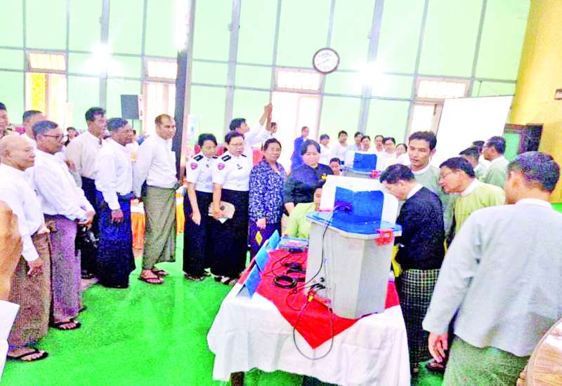 ဧရာဝတီတိုင်းဒေသကြီးနယ်မြေ မဲဆန္ဒရှင်ပြည်သူများ မြန်မာအီလက်ထရောနစ် မဲပေးစက်ဖြင့် လက်တွေ့စမ်းသပ်မဲပေးလေ့လာခြင်းကို ဖေဖော်ဝါရီ ၇ ရက်မှစ၍ ဆောင်ရွက်လျက်ရှိရာ ယနေ့တွင် မြောင်းမြမြို့နယ် ရပ်ကွက်/ကျေးရွာအုပ်စု ၁၁၄ ခုမှ ပြည်သူ ၆၁၅ ဦး တက်ရောက်ပြီး လက်တွေ့စမ်းသပ်မဲပေးလေ့လာကြသည်။