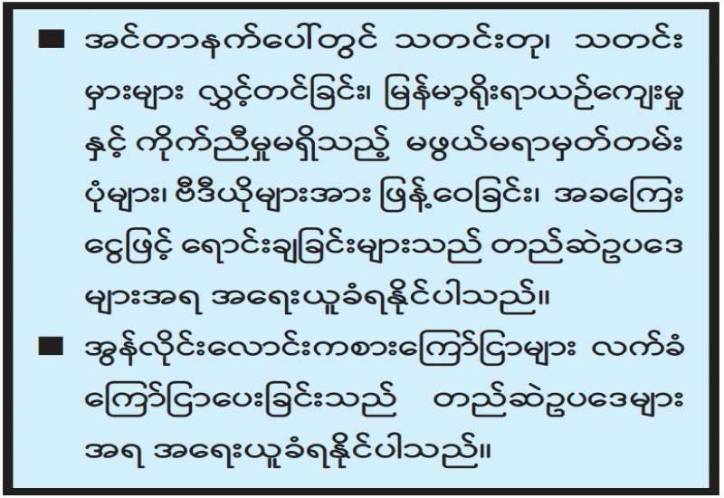 အင်တာနက်ပေါ်တွင် သတင်းတု၊ သတင်း မှားများ လွှင့်တင်ခြင်း၊ မြန်မာ့ရိုးရာယဉ်ကျေးမှု နှင့် ကိုက်ညီမှုမရှိသည့် မဖွယ်မရာမှတ်တမ်း ပုံများ၊ ဗီဒီယိုများအား ဖြန့်ဝေခြင်း၊ အခကြေး ငွေဖြင့် ရောင်းချခြင်းများသည် တည်ဆဲဥပဒေများအရ အရေးယူခံရနိုင်ပါသည်။ အွန်လိုင်းလောင်းကစားကြော်ငြာများ လက်ခံကြော်ငြာပေးခြင်းသည် တည်ဆဲဥပဒေများ အရ အရေးယူခံရနိုင်ပါသည်။