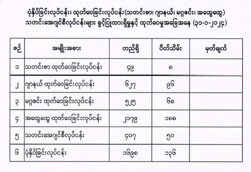 စိုက်ပျိုးမွေးမြူရေး ထုတ်ကုန်အမျိုးအစားအလိုက် ထုတ်လုပ်မှုလုပ်ငန်း စာရင်းပြုစုရေး ညှိနှိုင်းအစည်းအဝေး ကို ယနေ့နံနက်ပိုင်းတွင် စက်မှုဝန်ကြီးဌာန၌ ကျင်းပသည်။ အစည်းအဝေးသို့ ပြည်ထောင်စုဝန်ကြီး ဦးမင်းနောင်၊ ဦးလှမိုး၊ ဦးခင်မောင်ရီ၊ ဒေါက်တာ ချာလီသန်း၊ ဆက်စပ်ဝန်ကြီးဌာနများနှင့် စက်မှုဝန်ကြီးဌာနတို့မှ ဌာနဆိုင်ရာ အကြီးအကဲများနှင့် တာဝန်ရှိသူများ တက်ရောက်ကြသည်။