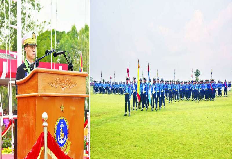 တပ်မတော်(ရေ) အရာရှိငယ် (စီမံခန့်ခွဲရေး) သင်တန်းအမှတ်စဉ်(၈၃)၊ တပ်မတော်(ရေ) အရာရှိငယ် (အင်ဂျင်နီယာ) သင်တန်းအမှတ်စဉ်(၅၇)နှင့် တပ်မတော်(ရေ) အမျိုးသမီးအရာရှိငယ် သင်တန်းအမှတ်စဉ်(၉) သင်တန်းဆင်းဂုဏ်ပြုစစ်ရေးပြအခမ်းအနားကို ယနေ့နံနက်ပိုင်းတွင် သန်လျင်တပ်နယ်ရှိ ရေတပ်လေ့ကျင့်ရေးဌာနချုပ် စစ်ရေးပြကွင်း၌ကျင်းပရာ နိုင်ငံတော်စီမံအုပ်ချုပ်ရေးကောင်စီဥက္ကဋ္ဌ တပ်မတော်ကာကွယ်ရေးဦးစီးချုပ်ကိုယ်စား ကာကွယ်ရေးဦးစီးချုပ်(ရေ) ဒုတိယဗိုလ်ချုပ်ကြီး ဇေယျကျော်ထင် ဇွဲဝင်းမြင့် တက်ရောက်မိန့်ခွန်းပြောကြားသည်။