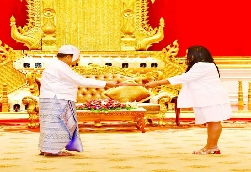 နိုင်ငံတော်စီမံအုပ်ချုပ်ရေးကောင်စီဥက္ကဋ္ဌ နိုင်ငံတော်ဝန်ကြီးချုပ် ဗိုလ်ချုပ်မှူးကြီး မင်းအောင်လှိုင်ထံ မြန်မာနိုင်ငံဆိုင်ရာ အီဂျစ်အာရပ်သမ္မတနိုင်ငံသံအမတ်ကြီးအဖြစ် ခန့်အပ်ရန် သဘောတူညီပြီးဖြစ်သော သံအမတ်ကြီး H.E. Mrs. Aya Saad Mohamed Abdelkarim သည် ယနေ့နံနက် ၁၀ နာရီ ၄၅ မိနစ်တွင် နေပြည်တော်ရှိ နိုင်ငံတော်စီမံအုပ်ချုပ်ရေးကောင်စီဥက္ကဋ္ဌရုံး၊ သံတမန်ဆောင်ဧည့်ခန်းမ၌ ၎င်း၏သံအမတ် ခန့်အပ်လွှာကို ပေးအပ်သည်။