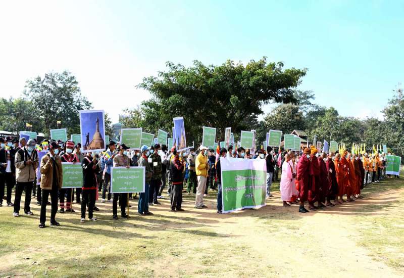 ရှမ်းပြည်နယ်(အရှေ့ပိုင်း)၊ တာချီလိတ်ခရိုင်၊ မိုင်းဖြတ်မြို့နယ်တွင် ဗုဒ္ဓဘာသာဝင်၊ မြန်မာတိုင်းရင်း သားများကိုးကွယ်လျက်ရှိသည့် ဘုရားစေတီများအား ဖျက်ဆီးသည့် အကြမ်းဖက်သမားများအား ကန့်ကွက်ရှုတ်ချခြင်းနှင့် ငြိမ်းချမ်းစွာဆန္ဒဖော်ထုတ်ပွဲကို ဇန်နဝါရီ ၁၃ရက်၊ နံနက် ၈နာရီခန့်က ဝမ်မိုင်ဘောလုံးကွင်း၌ ကျင်းပပြုလုပ်ခဲ့ကြောင်း သိရသည်။