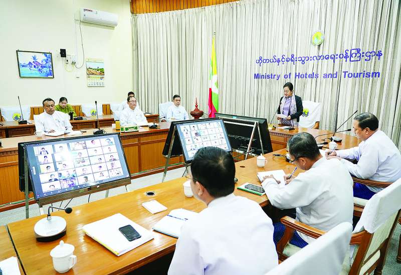 ဟိုတယ်နှင့် ခရီးသွားလာရေးဝန်ကြီးဌာန ပြည်ထောင်စုဝန်ကြီး ဒေါက်တာသက်သက်ခိုင်သည် ယနေ့နံနက်ပိုင်းက ခရီးသွားလုပ်ငန်းဆိုင်ရာ ဘာသာရပ်များ သင်ကြားပို့ချနေသည့် သင်တန်းကျောင်းများမှ တာဝန်ရှိသူများကို ဝန်ကြီးဌာန၏ နီလာခန်းမမှ အွန်လိုင်းစနစ်ဖြင့် တွေ့ဆုံသည်။