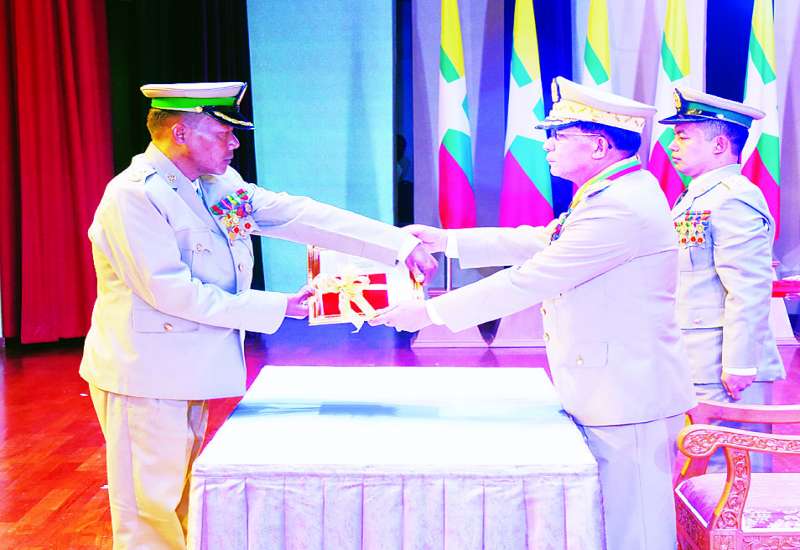 တပ်မတော်စွမ်းရည်သတ္တိဆိုင်ရာ ဂုဏ်ထူးဆောင်တံဆိပ်များ ချီးမြှင့်အပ်နှင်းခြင်းအခမ်းအနားကို ယနေ့ မွန်းလွဲပိုင်းတွင် နေပြည်တော်ရှိ ဇေယျာသီရိဗိမာန်၌ ကျင်းပပြုလုပ်ရာ နိုင်ငံတော်စီမံအုပ်ချုပ် ရေးကောင်စီဥက္ကဋ္ဌ တပ်မတော်ကာကွယ်ရေးဦးစီးချုပ် ဗိုလ်ချုပ်မှူးကြီး သတိုးမဟာသရေစည်သူ သတိုးသီရိသုဓမ္မမင်းအောင်လှိုင် တက်ရောက်မိန့်ခွန်းပြောကြားပြီး ဂုဏ်ထူးဆောင်တံဆိပ်များကို ချီးမြှင့်အပ်နှင်းပေးသည်။