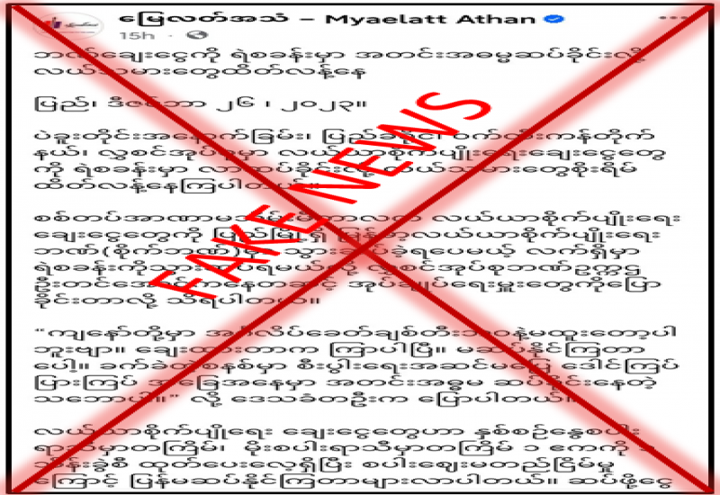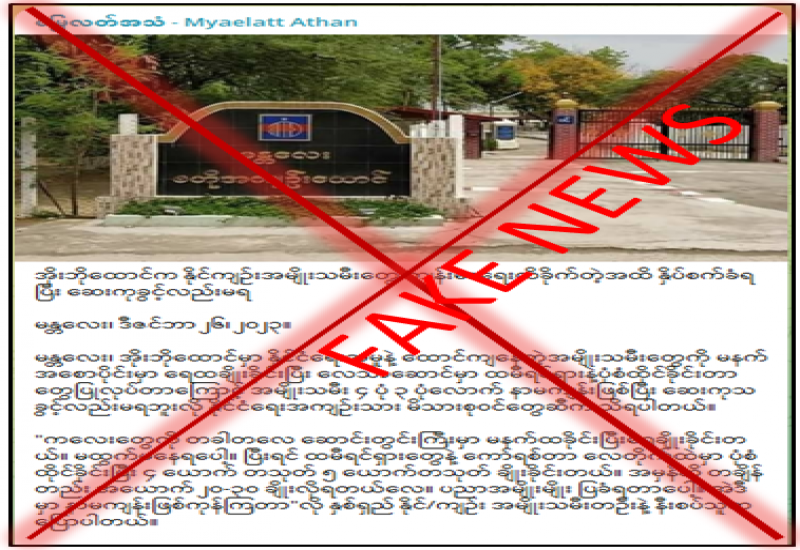 ပဲခူးတိုင်းဒေသကြီး၊ ပြည်ခရိုင်၊ ဝက်ထီးကန်တိုက်နယ်တွင် လယ်ယာစိုက်ပျိုးရေးချေးငွေများကို ရဲစခန်းမှာအတင်းအဓမ္မဆပ်ခိုင်းလို့ လယ်သမားများထိတ်လန့်နေကြောင်း၊ ချေးငွေမဆပ်နိုင်တဲ့သူတွေကို တရားစွဲပြီး ဖမ်းဆီးအရေးယူခိုင်းနေကြောင်း မဟုတ်မမှန် သတင်းတု၊ သတင်းအမှားများကို လူမှုကွန်ရက်စာမျက်နှာများတွင် ရေးသားဖြန့်ဝေနေသည်ကို တွေ့ရှိရသည်။