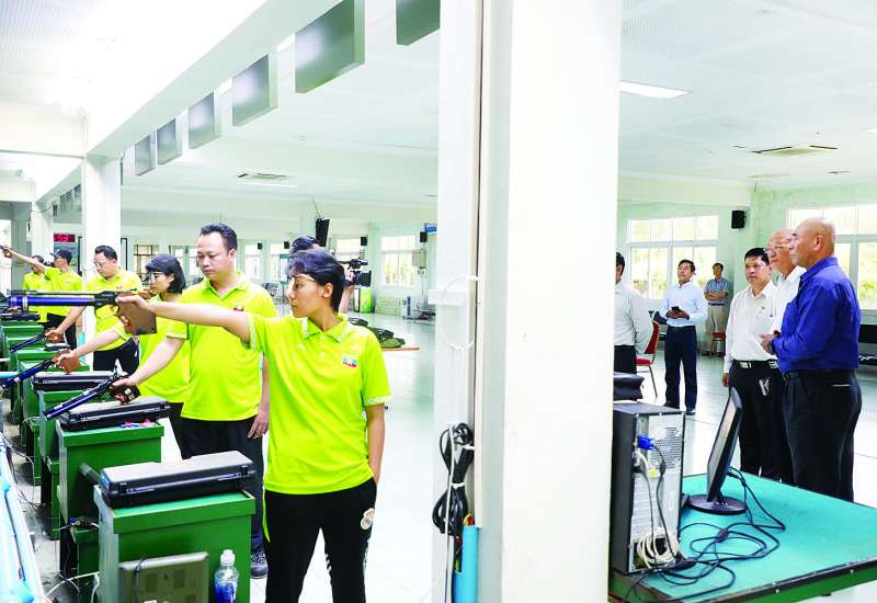 မြန်မာနိုင်ငံအိုလံပစ်ကော်မတီဥက္ကဋ္ဌ အားကစားနှင့်လူငယ်ရေးရာဝန်ကြီးဌာနနှင့် ဟိုတယ်နှင့်ခရီးသွားလာရေးဝန်ကြီးဌာန ပြည်ထောင်စုဝန်ကြီး Jeng Phang နော်တောင်သည် အားကစားနှင့်လူငယ်ရေးရာဝန်ကြီးဌာန ဒုတိယဝန်ကြီး ဦးထိန်လင်း၊ အားကစားနှင့်ကာယပညာဦးစီးဌာန ညွှန်ကြားရေးမှူးချုပ်နှင့်အတူ ယမန်နေ့မွန်းလွဲပိုင်းတွင် ရန်ကုန်မြို့၌ စခန်းဝင်လေ့ကျင့်လျက်ရှိသည့် သေနတ်ပစ်နှင့် မြားပစ်အားကစားအဖွဲ့များ၏ လေ့ကျင့်နေမှုများကို လိုက်လံကြည့်ရှုစစ်ဆေးသည်။
