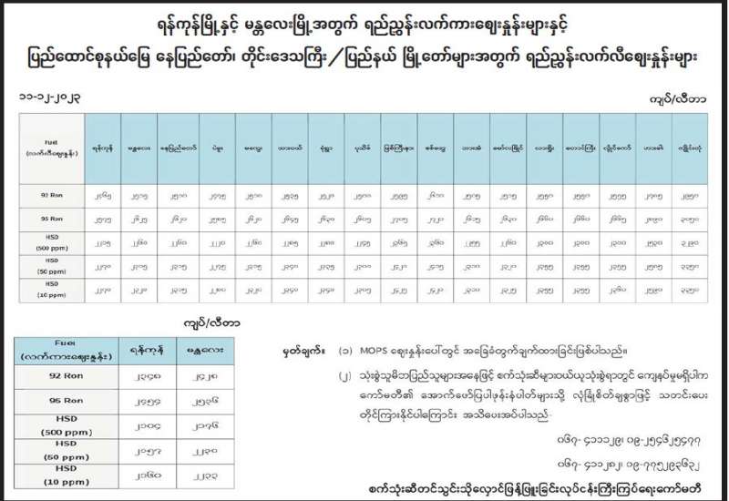 ရန်ကုန်မြို့နှင့် မန္တလေးမြို့အတွက် ရည်ညွှန်းလက်ကားဈေးနှုန်းများနှင့် ပြည်ထောင်စုနယ်မြေ နေပြည်တော်၊ တိုင်းဒေသကြီး/ ပြည်နယ် မြို့တော်များအတွက် ရည်ညွှန်းလက်လီဈေးနှုန်းများ