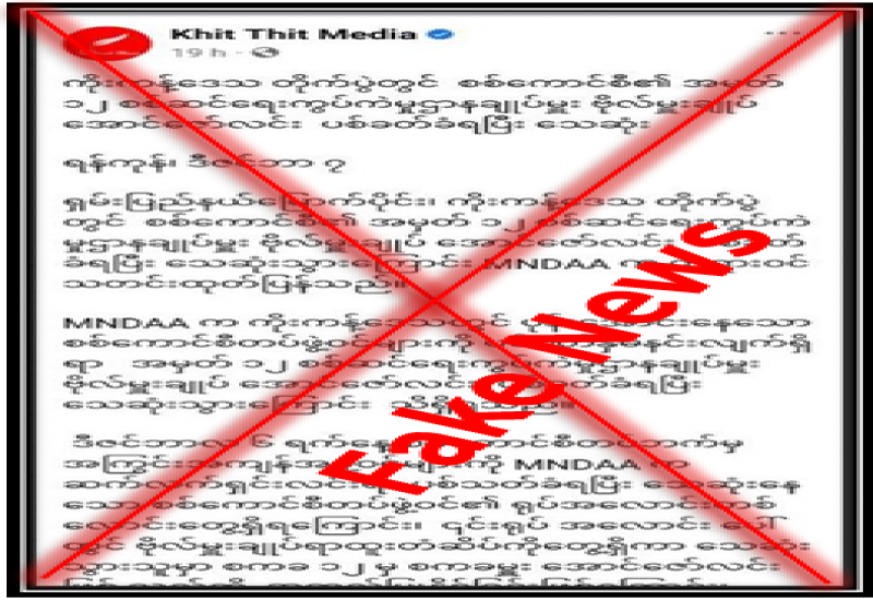 ရှမ်းပြည်နယ်(မြောက်ပိုင်း)၊ ကိုးကန့်ဒေသတိုက်ပွဲများတွင် တပ်မတော်မှစစ်ဆင်ရေးကွပ်ကဲရေးမှူး ဗိုလ်မှူးချုပ် အောင်ဇော်လင်းသည် ပစ်ခတ်ခံရ၍ သေဆုံးသွားပြီဟု တရားမဝင်ပြည်ဖျက်မီဒီယာတစ်ခုဖြစ်သည့် Khit Thit မီဒီယာ အပါအဝင် ပြည်ဖျက်မီဒီယာများက လူမှုကွန်ယက်စာမျက်နှာများပေါ်၌ မဟုတ်မမှန် လုပ်ကြံရေးသားဖြန့်ဝေလျက်ရှိသည်ကို တွေ့ရှိရသည်။