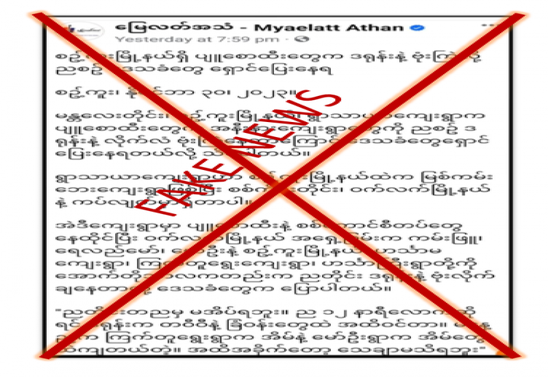 မန္တလေးတိုင်းဒေသကြီး၊ မိတ္ထီလာမြို့ရှိ လေတပ်စခန်းဌာနချုပ်မှ လေတပ်သား ၅၀၀ ဦး ရှမ်းမြောက်သို့ချီတက်ရန် ပြင်ဆင်နေကြောင်း မဟုတ်မမှန်လုပ်ကြံသတင်းများရေးသား၍ မဲခေါင်သတင်းမီဒီယာမှ လူမှုကွန်ရက်သတင်းစာမျက်နှာများတွင် ဖြန့်ဝေနေသည်ကို တွေ့ရှိရသည်။