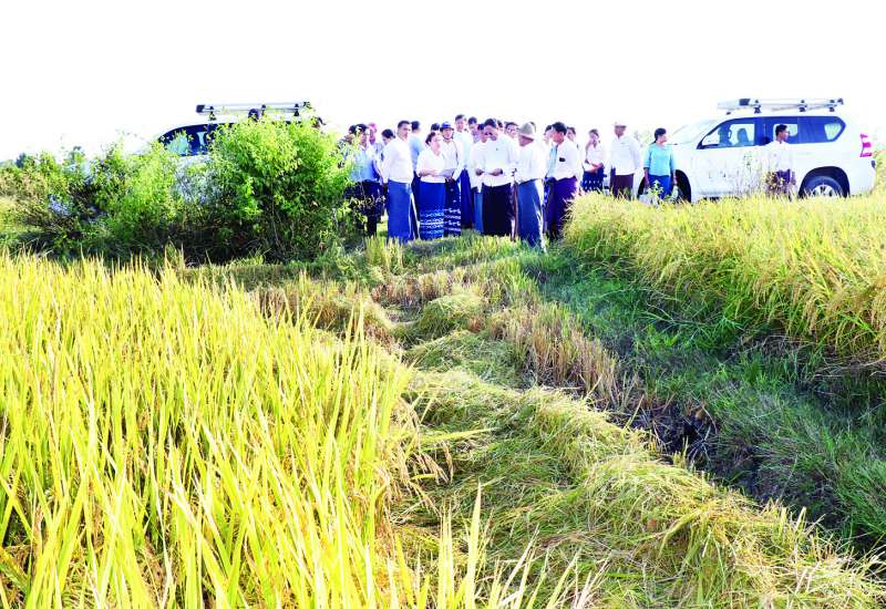 သမဝါယမနှင့် ကျေးလက်ဖွံ့ဖြိုးရေးဝန်ကြီးဌာန ပြည်ထောင်စုဝန်ကြီး ဦးလှမိုးသည် ယနေ့မွန်းလွဲပိုင်းက အမြဲတမ်းအတွင်းဝန်၊ ညွှန်ကြားရေးမှူးချုပ်များ၊ တာဝန်ရှိသူများနှင့်အတူ တပ်ကုန်းမြို့နယ် ရွေးစုကျေးရွာအုပ်စု ရွေးစုကျေးရွာသို့ သွားရောက်ပြီး သစ်လွင်လယ်ယာနှင့် အထွေထွေလုပ်ငန်းသမဝါယမအသင်းမှ အသင်းသား တောင်သူ ၅၂ ဦး၏ လယ်မြေ ၁၃၁ ဧကတွင် နိုင်ငံ့စီးပွားမြှင့်တင်ရေးရန်ပုံငွေဖြင့် စိုက်ပျိုးခဲ့သော GW-11 စပါးခင်းများနှင့် ဆင်းသုခစပါးခင်းများ ရိတ်သိမ်းခြွေလှေ့နေမှုကို ကြည့်ရှုအားပေးသည်။