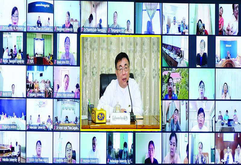 ပညာရေးဝန်ကြီးဌာန ပြည်ထောင်စုဝန်ကြီး ဒေါက်တာညွန့်ဖေသည် ယနေ့နံနက်ပိုင်းတွင် တက္ကသိုလ်ပါမောက္ခချုပ်များနှင့် ပညာရေးဒီဂရီ ကောလိပ်ကျောင်းအုပ်ကြီးများအား ဗီဒီယိုကွန်ဖရင့်စနစ်ဖြင့် တွေ့ဆုံသည်။
