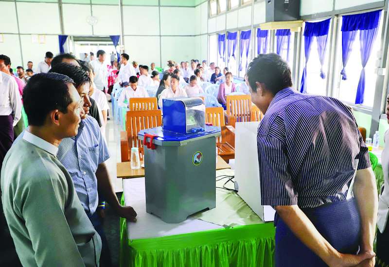 ပြည်ထောင်စု ရွေးကောက်ပွဲ ကော်မရှင်က မဲဆန္ဒရှင်ပြည်သူများနှင့်တွေ့ဆုံ၍ မြန်မာ အီလက်ထရောနစ် မဲပေးစက် (MEVM)နှင့်စပ်လျဉ်းပြီး ရှင်းလင်း ပြသခြင်းနှင့် လက်တွေ့သရုပ်ပြစမ်းသပ်မဲပေးခြင်းကို ယနေ့တွင် ဒုတိယနေ့အဖြစ် တပ်ကုန်း မြို့နယ်အထွေထွေအုပ်ချုပ်ရေးဦးစီးဌာန အစည်းအဝေးခန်းမ၌ ဆောင်ရွက်သည်။