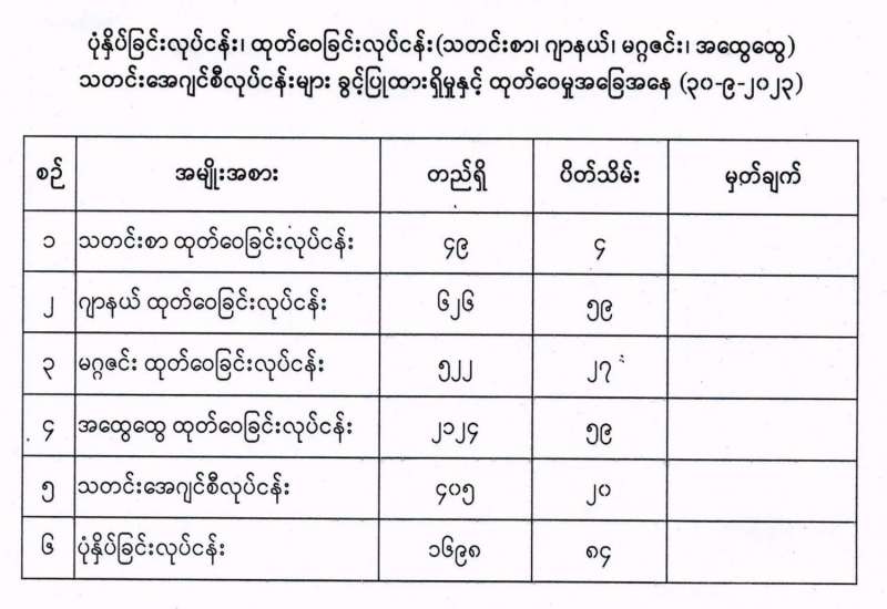 ၁။ သယံဇာတနှင့်သဘာဝပတ်ဝန်းကျင်ထိန်းသိမ်းရေးဝန်ကြီးဌာန၏ ကြီးကြပ်မှုဖြင့် မြန်မာ့ကျောက်မျက်ရတနာပြပွဲဗဟိုကော်မတီသည် ၂၀၂၃ ခုနှစ်၊ နှစ်လယ်မြန်မာ့ကျောက်မျက်ရတနာပြပွဲကို အောက်တိုဘာလ (၂၀)ရက်မှ (၂၈)ရက်အထိ နေပြည်တော်၊ မဏိရတနာကျောက်စိမ်းခန်းမတွင် ကျင်းပပြုလုပ်မည်ဖြစ်ပြီး ရတနာပြပွဲတွင် မြန်မာနိုင်ငံမှထွက်ရှိသော ပုလဲ၊ ကျောက်မျက်နှင့် ကျောက်စိမ်းအတွဲများကို တင်ပြရောင်းချသွားမည် ဖြစ်ပါသည်။