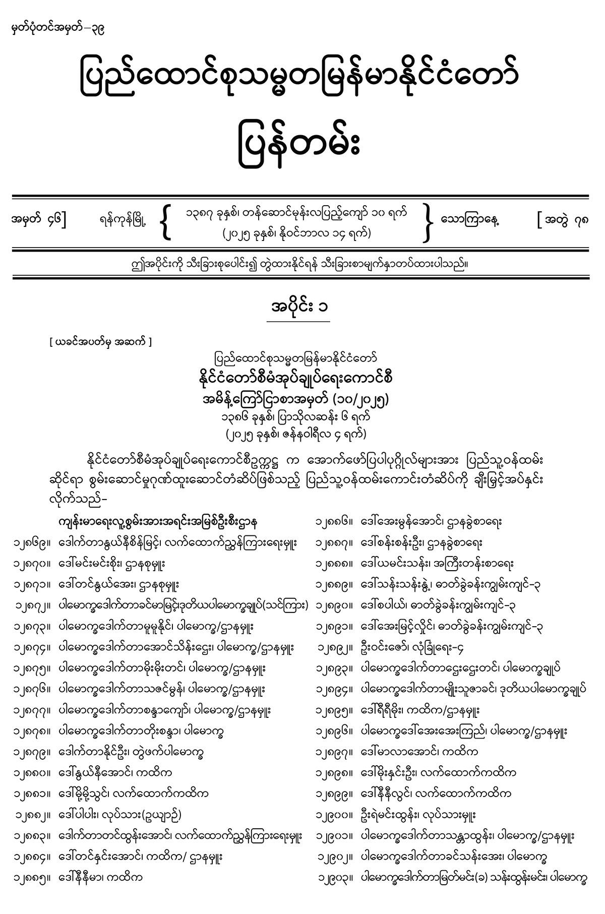 အပိုင်း (၁) တွင် နိုင်ငံတော်စီမံအုပ်ချုပ်ရေးကောင်စီ အမိန့်ကြော်ငြာစာ၊ အမျိုးသားကာကွယ် ရေးနှင့် လုံခြုံရေးကောင်စီရုံး အမိန့်ကြော်ငြာစာ၊ ပြည်ထောင်စုတရားလွှတ်တော်ချုပ် အမိန့်ကြော်ငြာစာ၊ ပုဂ္ဂလိကပိုင်ပြုလုပ်ရေးကော်မရှင် အမိန့်ကြော်ငြာစာ၊ မြေလွတ်၊ မြေလပ် နှင့် မြေရိုင်းများ စီမံခန့်ခွဲရေးဗဟိုကော်မတီ အမိန့်ကြော်ငြာစာ၊ ပို့ဆောင်ရေးနှင့် ဆက်သွယ်ရေးဝန်ကြီးဌာန (ဝန်ကြီးရုံး) အမိန့်ကြော်ငြာစာ၊ နိုင်ငံခြားရေးဝန်ကြီးဌာန အမိန့်ကြော်ငြာစာ၊ ပြည်ထဲရေးဝန်ကြီးဌာန အမိန့်ကြော်ငြာစာ၊ နယ်စပ်ရေးရာဝန်ကြီးဌာန (ဝန်ကြီးရုံး) အမိန့်ကြော်ငြာစာ၊ ရင်းနှီးမြှုပ်နှံမှုနှင့် နိုင်ငံခြားစီးပွားဆက်သွယ်ရေးဝန်ကြီးဌာန အမိန့်ကြော်ငြာစာ၊ စိုက်ပျိုးရေး၊ မွေးမြူရေးနှင့် ဆည်မြောင်းဝန်ကြီးဌာန (ပြည်ထောင်စု ဝန်ကြီးရုံး) အမိန့်ကြော်ငြာစာတို့ ပါဝင်ပါသည်။