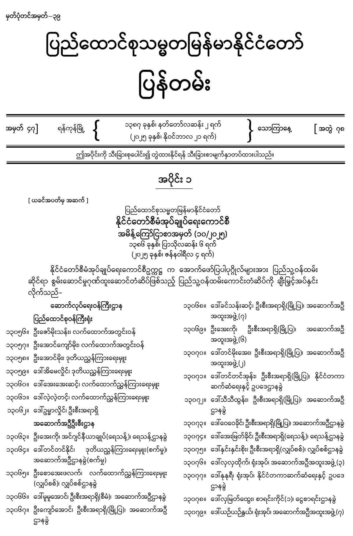အပိုင်း (၁) တွင် နိုင်ငံတော်စီမံအုပ်ချုပ်ရေးကောင်စီ အမိန့်ကြော်ငြာစာ၊ အမျိုးသားကာကွယ် ရေးနှင့် လုံခြုံရေးကောင်စီရုံး အမိန့်ကြော်ငြာစာ၊ ပြည်ထောင်စုတရားလွှတ်တော်ချုပ် အမိန့်ကြော်ငြာစာ၊ ပြည်ထောင်စုရွေးကောက်ပွဲကော်မရှင် အမိန့်ကြော်ငြာစာ၊ နိုင်ငံခြားသား အမြဲနေထိုင်ခွင့်ပြုခြင်းဆိုင်ရာ အကောင်အထည်ဖော်ရေးဗဟိုကော်မတီ အမိန့်ကြော်ငြာစာ၊ ဗဟိုလယ်ယာမြေစီမံခန့်ခွဲမှုအဖွဲ့ အမိန့်ကြော်ငြာစာ၊ ပို့ဆောင်ရေးနှင့် ဆက်သွယ်ရေးဝန်ကြီး ဌာန (ဝန်ကြီးရုံး) အမိန့်ကြော်ငြာစာ၊ ဘဏ္ဍာရေးနှင့် အခွန်ဝန်ကြီးဌာန အမိန့်ကြော်ငြာစာ၊ နိုင်ငံခြားရေးဝန်ကြီးဌာန အမိန့်ကြော်ငြာစာ၊ ပြည်ထဲရေးဝန်ကြီးဌာန (ဝန်ကြီးရုံး) အမိန့် ကြော်ငြာစာ၊ နယ်စပ်ရေးရာဝန်ကြီးဌာန (ဝန်ကြီးရုံး) အမိန့်ကြော်ငြာစာ၊ ပြန်ကြားရေးဝန်ကြီးဌာန (ဝန်ကြီးရုံး) အမိန့်ကြော်ငြာစာ၊ စိုက်ပျိုးရေး၊ မွေးမြူရေးနှင့် ဆည်မြောင်း ဝန်ကြီးဌာန (ပြည်ထောင်စုဝန်ကြီးရုံး) အမိန့်ကြော်ငြာစာ၊ စက်မှုဝန်ကြီးဌာန အမိန့် ကြော်ငြာစာ၊ ဆောက်လုပ်ရေးဝန်ကြီးဌာန အမိန့်ကြော်ငြာစာ၊ ရန်ကုန်တိုင်းဒေသကြီး အစိုးရအဖွဲ့ ရန်ကုန်မြို့တော်စည်ပင်သာယာရေးကော်မတီ အမိန့်ကြော်ငြာစာတို့ ပါဝင်ပါသည်။