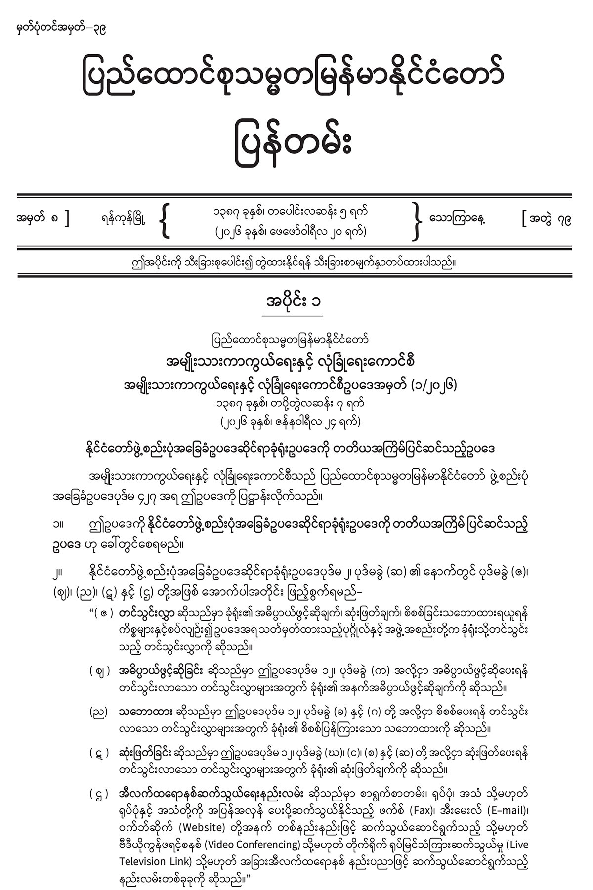 ပြည်ထောင်စုသမ္မတမြန်မာနိုင်ငံတော်ပြန်တမ်းများကို ပြန်ကြားရေးဝန်ကြီးဌာန၊ ပုံနှိပ်ရေး နှင့် ထုတ်ဝေရေးဦးစီးဌာနက ထုတ်ဝေဖြန့်ချိလျက်ရှိရာ ၂၀၂၆ ခုနှစ်၊ ဖေဖော်ဝါရီလ ၂၀ ရက် ထုတ် အတွဲ (၇၉)၊ အမှတ် (၈) ပြန်တမ်းစာစောင်ကို စာပေဗိမာန်စာအုပ်အရောင်းဆိုင် များမှတစ်ဆင့် စတင်ဖြန့်ချိရောင်းချနေပြီ ဖြစ်ပါသည်။ ယခုအပတ်ထုတ် မြန်မာနိုင်ငံတော် ပြန်တမ်းတွင် အပိုင်း (၁)၊ အပိုင်း (၂) နှင့် အပိုင်း (၄) တို့ ပါရှိပါသည်။