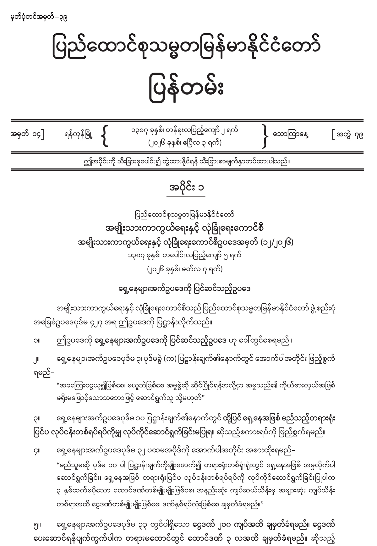 အပိုင်း (၁) တွင် အမျိုးသားကာကွယ်ရေးနှင့် လုံခြုံရေးကောင်စီရုံး အမိန့်ကြော်ငြာစာ၊ ပြည်ထောင်စုတရားလွှတ်တော်ချုပ် အမိန့်ကြော်ငြာစာတို့ ပါဝင်ပါသည်။