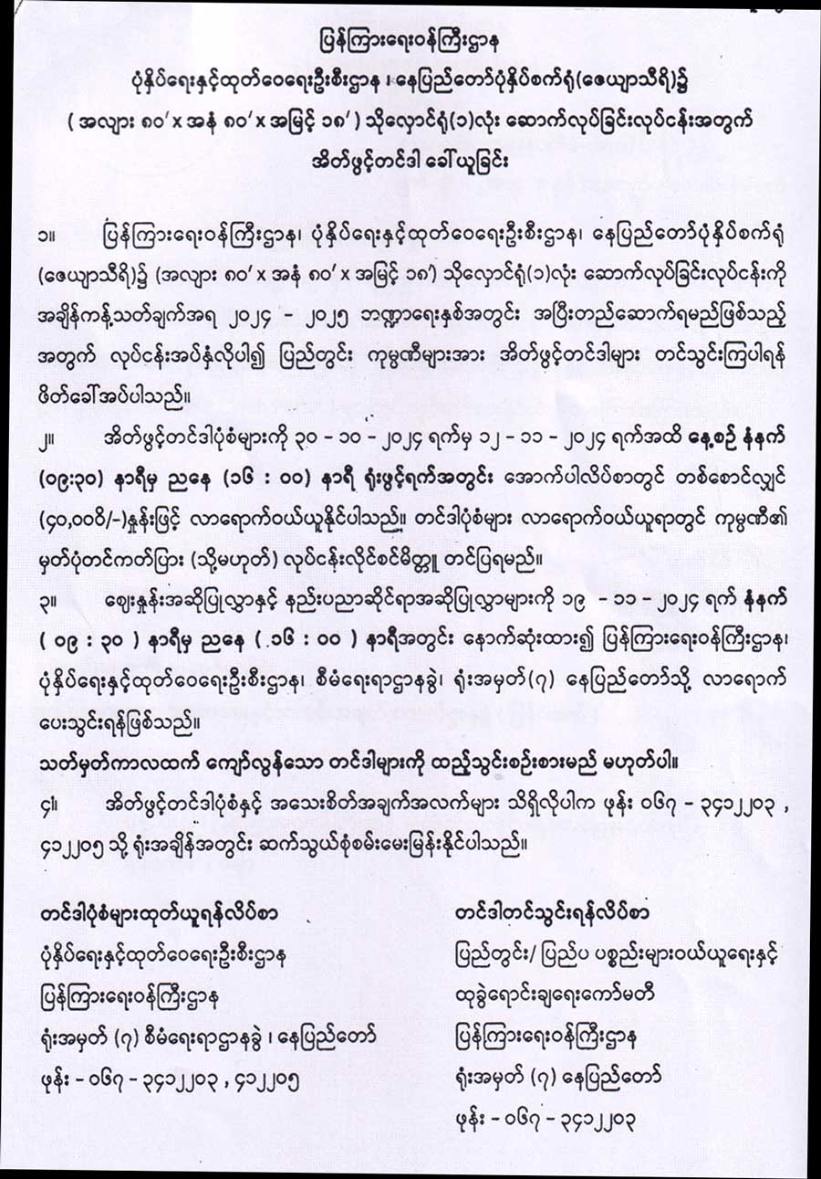 (ဇေယျာသီရိ) ၌ (အလျား ၈၀ ပေ x အနံ ၈၀ ပေ x အမြင့် ၁၈ ပေ) သိုလှောင်ရုံ (၁) လုံး ဆောက်လုပ်ခြင်းလုပ်ငန်းကို အချိန်ကန့်သတ်ချက်အရ ၂၀၂၄-၂၀၂၅ ဘဏ္ဍာရေးနှစ်အတွင်း အပြီးတည်ဆောက်ရမည်ဖြစ်သည့်အတွက် လုပ်ငန်းအပ်နှံလိုပါ၍ ပြည်တွင်းကုမ္ပဏီများအား အိတ်ဖွင့်တင်ဒါများ တင်သွင်းကြပါရန် ဖိတ်ခေါ်အပ်ပါသည် -