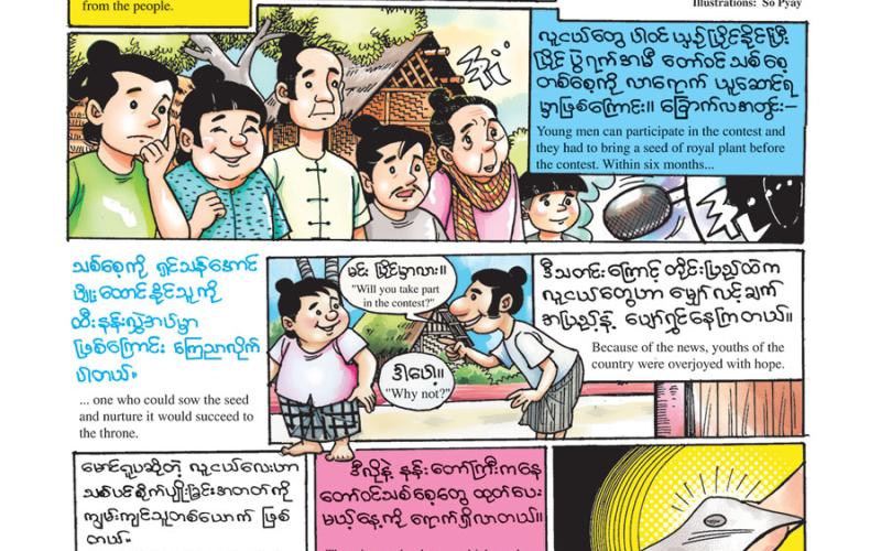 သုတကဏ္ဍအနေဖြင့် ပြုံးခြင်း၊ ရယ်မောခြင်းသည် ကျန်းမာအသက်ရှည်နုပျိုစေနိုင်သည့် အကြောင်းရင်းများထဲက တစ်ခုဖြစ်ကြောင်း ရေးသားထားပါသည်။ ဝတ္ထုကဏ္ဍတွင် မိမိ၏ ကျန်းမာရေးကို အန္တရာယ်ဖြစ်စေနိုင်သည့် မုန့်ပဲသရေစာများကို မစားမိရန် သတိပြု ရှောင်ကြဉ်ရ မည်ဖြစ်ကြောင်း ရေးသားထားပါသည်။ ပုံပြင်ကဏ္ဍအနေဖြင့် မှော်သော့တံကို အကျိုးရှိရှိ အသုံးမချခဲ့ခြင်းကြောင့် ၎င်းသော့တံကို အပြီးတိုင် ဆုံးရှုံးလိုက်ရသော ဒန်နီအကြောင်း ဖတ်ရှုရမည် ဖြစ်ပါသည်။ ထို့ပြင် ကလေးတို့ကိုယ်တိုင် ရေးဆွဲထားသည့် ပန်းချီလက်ရာများကို တင်ဆက်ထား သည့် ရွှေသွေးတို့လက်ရာကဏ္ဍနှင့် အထူးသတိပြုဖွယ် မီးဘေးအန္တရာယ်အကြောင်း ရေးဖွဲ့ထားသည့် ဆရာမင်းရွှေမိုး၏ “မီးသတိပြု” ကဗျာကဏ္ဍတို့ကိုလည်း တင်ဆက်ထားပါသည်။ အင်္ဂလိပ်စာ ကဏ္ဍအနေဖြင့် မိမိဝယ်ရန် လိုအပ်သည့် ပစ္စည်းကို တစ်စုံတစ်ယောက်အား စတိုးဆိုင်သွားပြီး ဝယ်ခိုင်းသည်ကို အသုံးအနှုန်းမတူဘဲ အဓိပ္ပာယ်တူပြောဆိုပုံကို ကလေးတို့ လေ့လာမှတ်သားနိုင်မည် ဖြစ်ပါသည်။