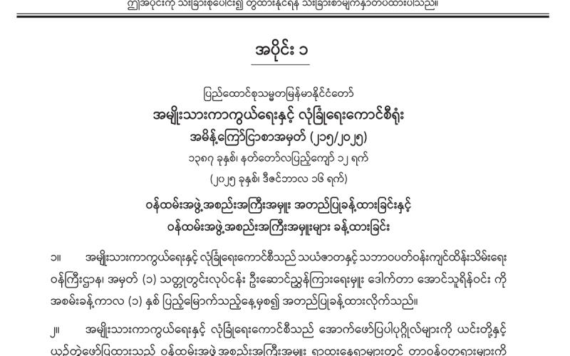 အပိုင်း (၁) တွင် အမျိုးသားကာကွယ်ရေးနှင့် လုံခြုံရေးကောင်စီရုံး အမိန့်ကြော်ငြာစာ၊ ပုဂ္ဂလိကပိုင်ပြုလုပ်ရေးကော်မရှင် အမိန့်ကြော်ငြာစာ၊ အမျိုးသားသဘာဝဘေးအန္တရာယ် ဆိုင်ရာ စီမံခန့်ခွဲမှုကော်မတီ အမိန့်ကြော်ငြာစာ၊ စက်မှုလုပ်ငန်းနှင့် စက်မှုဇုန်ဖွံ့ဖြိုး တိုးတက်ရေးဗဟိုကော်မတီ အမိန့်ကြော်ငြာစာ၊ နိုင်ငံအဆင့် ပင်လယ်ကမ်းရိုးတန်း သယံဇာတစီမံအုပ်ချုပ်လုပ်ကိုင်မှုဗဟိုကော်မတီ အမိန့်ကြော်ငြာစာ၊ မြေလွတ်၊ မြေလပ်နှင့် မြေရိုင်းများစီမံခန့်ခွဲရေးဗဟိုကော်မတီ အမိန့်ကြော်ငြာစာ၊ ခရီးသွားလုပ်ငန်းကော်မတီ အမိန့် ကြော်ငြာစာ၊ ကုန်သွယ်မှုနှင့် ကုန်စည်စီးဆင်းမှုများ မှန်ကန်မြန်ဆန်စေရေး ဗဟိုကော်မတီ အမိန့်ကြော်ငြာစာ၊ အမျိုးသားမြေအသုံးချမှုကောင်စီ အမိန့်ကြော်ငြာစာ၊ မြန်မာနိုင်ငံ အစား အသောက်နှင့် ဆေးဝါးအာဏာပိုင်အဖွဲ့ အမိန့်ကြော်ငြာစာ၊ အမျိုးသားစီမံကိန်းဝန်ကြီးဌာန အမိန့်ကြော်ငြာစာ၊ ပို့ဆောင်ရေးနှင့် ဆက်သွယ်ရေးဝန်ကြီးဌာန (ဝန်ကြီးရုံး) အမိန့် ကြော်ငြာစာ၊ ဘဏ္ဍာရေးနှင့် အခွန်ဝန်ကြီးဌာန အမိန့်ကြော်ငြာစာ၊ ပြည်ထဲရေးဝန်ကြီးဌာန (ဝန်ကြီးရုံး) အမိန့်ကြော်ငြာစာ၊ နယ်စပ်ရေးရာဝန်ကြီးဌာန (ဝန်ကြီးရုံး) အမိန့်ကြော်ငြာစာ၊ တိုင်းရင်းသားလူမျိုးများရေးရာဝန်ကြီးဌာန (ပြည်ထောင်စုဝန်ကြီးရုံး) အမိန့်ကြော်ငြာစာ၊ ပြန်ကြားရေးဝန်ကြီးဌာန အမိန့်ကြော်ငြာစာ၊ သာသနာရေးနှင့် ယဉ်ကျေးမှုဝန်ကြီးဌာန အမိန့် ကြော်ငြာစာ၊ စိုက်ပျိုးရေး၊ မွေးမြူရေးနှင့် ဆည်မြောင်းဝန်ကြီးဌာန (ပြည်ထောင်စုဝန်ကြီးရုံး) အမိန့်ကြော်ငြာစာ၊ သယံဇာတနှင့် သဘာဝပတ်ဝန်းကျင်ထိန်းသိမ်းရေးဝန်ကြီးဌာန (ပြည် ထောင်စုဝန်ကြီးရုံး) အမိန့်ကြော်ငြာစာ၊ လျှပ်စစ်စွမ်းအားဝန်ကြီးဌာန အမိန့်ကြော်ငြာစာ၊ စက်မှုဝန်ကြီးဌာန အမိန့်ကြော်ငြာစာ၊ စီးပွားရေးနှင့် ကူးသန်းရောင်းဝယ်ရေးဝန်ကြီးဌာန (ပြည်ထောင်စုဝန်ကြီးရုံး) အမိန့်ကြော်ငြာစာ၊ ပညာရေးဝန်ကြီးဌာန (ဝန်ကြီးရုံး) အမိန့် ကြော်ငြာစာ၊ သိပ္ပံနှင့် နည်းပညာဝန်ကြီးဌာန (ဝန်ကြီးရုံး) အမိန့်ကြော်ငြာစာ၊ အားကစားနှင့် လူငယ်ရေးရာဝန်ကြီးဌာန အမိန့်ကြော်ငြာစာ၊ ဟိုတယ်နှင့် ခရီးသွားလာရေးဝန်ကြီးဌာန (ပြည်ထောင်စုဝန်ကြီးရုံး) အမိန့်ကြော်ငြာစာ၊ ဆောက်လုပ်ရေးဝန်ကြီးဌာန (ပြည်ထောင်စု ဝန်ကြီးရုံး) အမိန့်ကြော်ငြာစာ၊ လူမှုဝန်ထမ်း၊ ကယ်ဆယ်ရေးနှင့် ပြန်လည်နေရာချထားရေး ဝန်ကြီးဌာန (ဝန်ကြီးရုံး) အမိန့်ကြော်ငြာစာ၊ ပြည်ထောင်စုစာရင်းစစ်ချုပ်ရုံး အမိန့် ကြော်ငြာစာ၊ ပြည်ထောင်စုရာထူးဝန်အဖွဲ့ အမိန့်ကြော်ငြာစာ၊ နေပြည်တော်စည်ပင် သာယာရေးကော်မတီ အမိန့်ကြော်ငြာစာတို့ ပါဝင်ပါသည်။