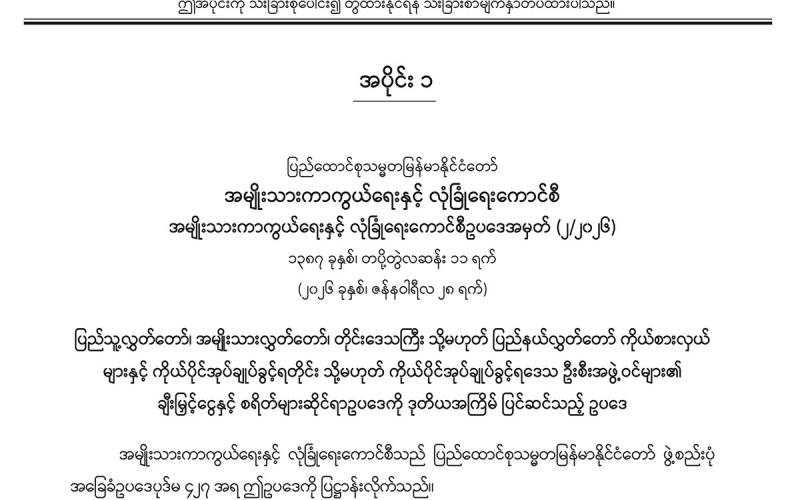 အပိုင်း (၁) တွင် အမျိုးသားကာကွယ်ရေးနှင့် လုံခြုံရေးကောင်စီရုံး အမိန့်ကြော်ငြာစာ၊ ပြည်ထောင်စုတရားလွှတ်တော်ချုပ် အမိန့်ကြော်ငြာစာ၊ နိုင်ငံတော်ဖွဲ့စည်းပုံအခြေခံဥပဒေ ဆိုင်ရာခုံရုံး အမိန့်ကြော်ငြာစာ၊ သယံဇာတနှင့် သဘာဝပတ်ဝန်းကျင်ထိန်းသိမ်းရေး ဝန်ကြီး ဌာန အမိန့်ကြော်ငြာစာ၊ လျှပ်စစ်စွမ်းအားဝန်ကြီးဌာန အမိန့်ကြော်ငြာစာ၊ ပြည်ထောင်စု ရာထူးဝန်အဖွဲ့ အမိန့်ကြော်ငြာစာတို့ ပါဝင်ပါသည်။