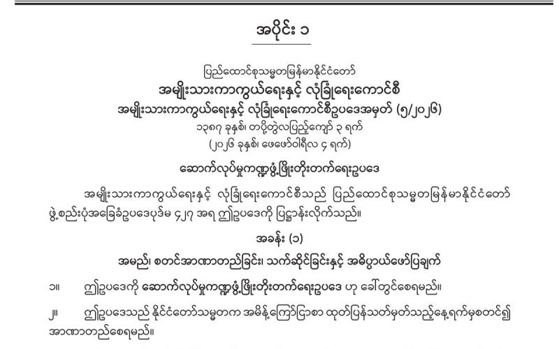 အပိုင်း (၁) တွင် အမျိုးသားကာကွယ်ရေးနှင့် လုံခြုံရေးကောင်စီရုံး အမိန့်ကြော်ငြာစာ၊ ပြည်ထောင်စုတရားလွှတ်တော်ချုပ် အမိန့်ကြော်ငြာစာ၊ ခရီးသွားလုပ်ငန်းကော်မတီ အမိန့် ကြော်ငြာစာ၊ မြန်မာနိုင်ငံ ကလေးအလုပ်သမားပပျောက်ရေးဆိုင်ရာအမျိုးသားကော်မတီ အမိန့်ကြော်ငြာစာ၊ ပို့ဆောင်ရေးနှင့် ဆက်သွယ်ရေးဝန်ကြီးဌာန (ဝန်ကြီးရုံး) အမိန့် ကြော်ငြာစာ၊ ကာကွယ်ရေးဝန်ကြီးဌာန အမိန့်ကြော်ငြာစာ၊ ဘဏ္ဍာရေးနှင့် အခွန်ဝန်ကြီးဌာန အမိန့်ကြော်ငြာစာ၊ ပြည်ထဲရေးဝန်ကြီးဌာန (ဝန်ကြီးရုံး) အမိန့်ကြော်ငြာစာ၊ နယ်စပ်ရေးရာ ဝန်ကြီးဌာန (ဝန်ကြီးရုံး) အမိန့်ကြော်ငြာစာ၊ တိုင်းရင်းသားလူမျိုးများရေးရာဝန်ကြီးဌာန (ပြည်ထောင်စုဝန်ကြီးရုံး) အမိန့်ကြော်ငြာစာ၊ ရင်းနှီးမြှုပ်နှံမှုနှင့် နိုင်ငံခြားစီးပွား ဆက် သွယ်ရေးဝန်ကြီးဌာန အမိန့်ကြော်ငြာစာ၊ ရင်းနှီးမြှုပ်နှံမှုနှင့် နိုင်ငံခြားစီးပွားဆက်သွယ်ရေး ဝန်ကြီးဌာန တင်ဒါကော်မတီ အမိန့်ကြော်ငြာစာ၊ ပြန်ကြားရေးဝန်ကြီးဌာန အမိန့် ကြော်ငြာစာ၊ သာသနာရေးနှင့် ယဉ်ကျေးမှုဝန်ကြီးဌာန အမိန့်ကြော်ငြာစာ၊ စိုက်ပျိုးရေး၊ မွေးမြူရေးနှင့် ဆည်မြောင်းဝန်ကြီးဌာန (ပြည်ထောင်စုဝန်ကြီးရုံး) အမိန့်ကြော်ငြာစာ၊ သယံဇာတနှင့် သဘာဝပတ်ဝန်းကျင်ထိန်းသိမ်းရေးဝန်ကြီးဌာန အမိန့်ကြော်ငြာစာ၊ လျှပ်စစ် စွမ်းအားဝန်ကြီးဌာန အမိန့်ကြော်ငြာစာ၊ စက်မှုဝန်ကြီးဌာန အမိန့်ကြော်ငြာစာ၊ လူဝင်မှု ကြီးကြပ်ရေးနှင့် ပြည်သူ့အင်အားဝန်ကြီးဌာန (ဝန်ကြီးရုံး) အမိန့်ကြော်ငြာစာ၊ စီးပွားရေးနှင့် ကူးသန်းရောင်းဝယ်ရေးဝန်ကြီးဌာန အမိန့်ကြော်ငြာစာ၊ ပညာရေးဝန်ကြီးဌာန (ဝန်ကြီးရုံး) အမိန့်ကြော်ငြာစာ၊ အားကစားနှင့် လူငယ်ရေးရာဝန်ကြီးဌာန အမိန့်ကြော်ငြာစာ၊ ဟိုတယ်နှင့် ခရီးသွားလာရေးဝန်ကြီးဌာန (ဝန်ကြီးရုံး) အမိန့်ကြော်ငြာစာ၊ ဆောက်လုပ်ရေးဝန်ကြီးဌာန (ပြည်ထောင်စုဝန်ကြီးရုံး) အမိန့်ကြော်ငြာစာ၊ ပြည်ထောင်စုစာရင်းစစ်ချုပ်ရုံး အမိန့် ကြော်ငြာစာ၊ ပြည်ထောင်စုရာထူးဝန်အဖွဲ့ အမိန့်ကြော်ငြာစာတို့ ပါဝင်ပါသည်။