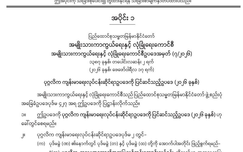 အပိုင်း (၁) တွင် အမျိုးသားကာကွယ်ရေးနှင့် လုံခြုံရေးကောင်စီရုံး အမိန့်ကြော်ငြာစာ၊ ပြည်ထောင်စုအစိုးရအဖွဲ့ အမိန့်ကြော်ငြာစာ၊ ပြည်ထောင်စုတရားလွှတ်တော်ချုပ် အမိန့် ကြော်ငြာစာ၊ နိုင်ငံတော်ဖွဲ့စည်းပုံအခြေခံဥပဒေဆိုင်ရာခုံရုံး အမိန့်ကြော်ငြာစာ၊ အမျိုးသား ခရီးသွားလုပ်ငန်းဖွံ့ဖြိုးတိုးတက်ရေးဗဟိုကော်မတီ အမိန့်ကြော်ငြာစာ၊ ခရီးသွားလုပ်ငန်း ကော်မတီ အမိန့်ကြော်ငြာစာ၊ မြန်မာနိုင်ငံ ကလေးအလုပ်သမားပပျောက်ရေးဆိုင်ရာ အမျိုးသားကော်မတီ အမိန့်ကြော်ငြာစာ၊ အသေးစားငွေရေးကြေးရေး လုပ်ငန်းကြီးကြပ်မှု ကော်မတီ အမိန့်ကြော်ငြာစာ၊ အမျိုးသားစီမံကိန်းဝန်ကြီးဌာန အမိန့်ကြော်ငြာစာ၊ နိုင်ငံတော် သမ္မတရုံးဝန်ကြီးဌာန(၄) အမိန့်ကြော်ငြာစာ၊ ပို့ဆောင်ရေးနှင့် ဆက်သွယ်ရေးဝန်ကြီးဌာန (ဝန်ကြီးရုံး) အမိန့်ကြော်ငြာစာ၊ ဘဏ္ဍာရေးနှင့် အခွန်ဝန်ကြီးဌာန အမိန့်ကြော်ငြာစာ၊ နိုင်ငံခြားရေးဝန်ကြီးဌာန အမိန့်ကြော်ငြာစာ၊ ပြည်ထဲရေးဝန်ကြီးဌာန အမိန့်ကြော်ငြာစာ၊ နယ်စပ်ရေးရာဝန်ကြီးဌာန (ဝန်ကြီးရုံး) အမိန့်ကြော်ငြာစာ၊ ရင်းနှီးမြှုပ်နှံမှုနှင့် နိုင်ငံခြားစီးပွား ဆက်သွယ်ရေးဝန်ကြီးဌာန အမိန့်ကြော်ငြာစာ၊ ရင်းနှီးမြှုပ်နှံမှုနှင့် နိုင်ငံခြားစီးပွား ဆက်သွယ်ရေးဝန်ကြီးဌာန တင်ဒါကော်မတီ အမိန့်ကြော်ငြာစာ၊ ပြန်ကြားရေးဝန်ကြီးဌာန အမိန့်ကြော်ငြာစာ၊ သာသနာရေးနှင့် ယဉ်ကျေးမှုဝန်ကြီးဌာန အမိန့်ကြော်ငြာစာ၊ စိုက်ပျိုးရေး၊ မွေးမြူရေးနှင့် ဆည်မြောင်းဝန်ကြီးဌာန (ပြည်ထောင်စုဝန်ကြီးရုံး) အမိန့်ကြော်ငြာစာ၊ သယံဇာတနှင့် သဘာဝပတ်ဝန်းကျင်ထိန်းသိမ်းရေးဝန်ကြီးဌာန အမိန့်ကြော်ငြာစာ၊ လျှပ်စစ်စွမ်းအားဝန်ကြီးဌာန အမိန့်ကြော်ငြာစာ၊ စွမ်းအင်ဝန်ကြီးဌာန အမိန့်ကြော်ငြာစာ၊ စက်မှုဝန်ကြီးဌာန အမိန့်ကြော်ငြာစာ၊ စီးပွားရေးနှင့် ကူးသန်းရောင်းဝယ်ရေးဝန်ကြီးဌာန (ပြည်ထောင်စုဝန်ကြီးရုံး) အမိန့်ကြော်ငြာစာ၊ ပညာရေးဝန်ကြီးဌာန (ဝန်ကြီးရုံး) အမိန့် ကြော်ငြာစာ၊ သိပ္ပံနှင့်နည်းပညာဝန်ကြီးဌာန (ဝန်ကြီးရုံး) အမိန့်ကြော်ငြာစာ၊ အားကစားနှင့် လူငယ်ရေးရာဝန်ကြီးဌာန အမိန့်ကြော်ငြာစာ၊ ဟိုတယ်နှင့် ခရီးသွားလာရေးဝန်ကြီးဌာန (ဝန်ကြီးရုံး) အမိန့်ကြော်ငြာစာ၊ ဆောက်လုပ်ရေးဝန်ကြီးဌာန အမိန့်ကြော်ငြာစာ၊ လူမှု ဝန်ထမ်း၊ ကယ်ဆယ်ရေးနှင့် ပြန်လည်နေရာချထားရေးဝန်ကြီးဌာန (ဝန်ကြီးရုံး) အမိန့် ကြော်ငြာစာ၊ ပြည်ထောင်စုစာရင်းစစ်ချုပ်ရုံး အမိန့်ကြော်ငြာစာ၊ ပြည်ထောင်စုရာထူးဝန်အဖွဲ့ အမိန့်ကြော်ငြာစာ၊ မြန်မာနိုင်ငံတော်ဗဟိုဘဏ် အမိန့်ကြော်ငြာစာ၊ ရန်ကုန်တိုင်းဒေသကြီး အစိုးရအဖွဲ့ ရန်ကုန်မြို့တော်စည်ပင်သာယာရေးကော်မတီ အမိန့်ကြော်ငြာစာတိ